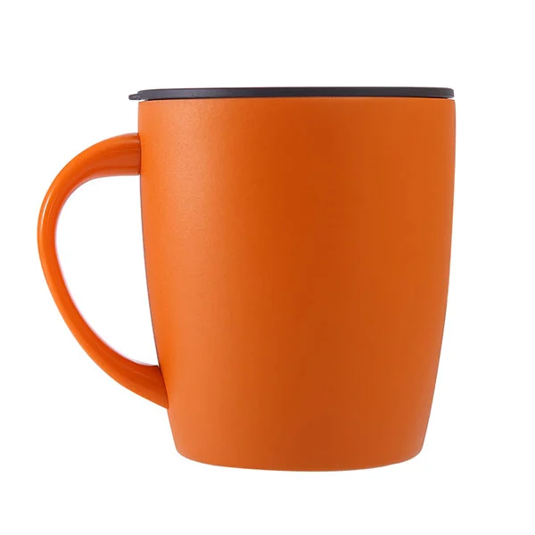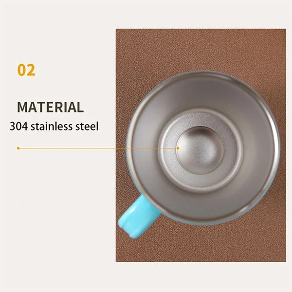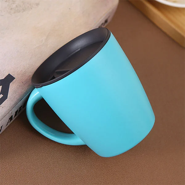Dette er et trend-utseende kaffekrus i rustfritt stål med lokk, avrundet utseende, la deg holde et godt humør, plassert på bordet, er også et kunstverk.