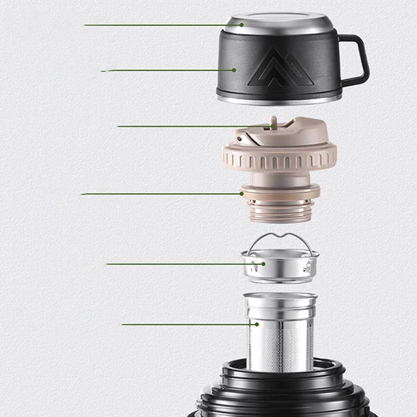 Vakuumisolert reisekoker, laget av 316 rustfritt stål og 201 rustfritt stål, med en indre foring laget av høykvalitets 316 rustfritt stål, som er anti-oksidasjon og har ingen lukt selv etter langvarig vannlagring.