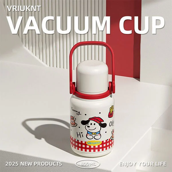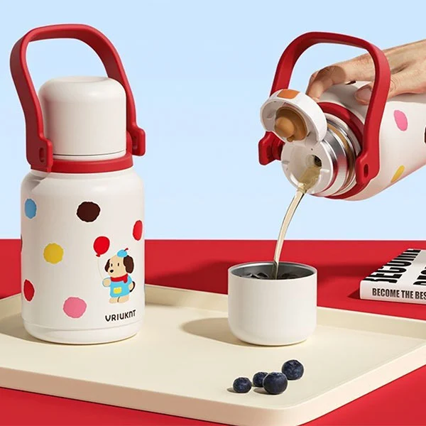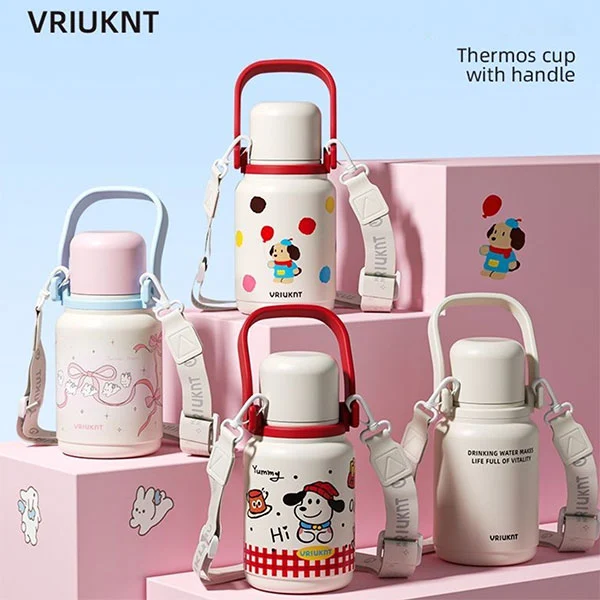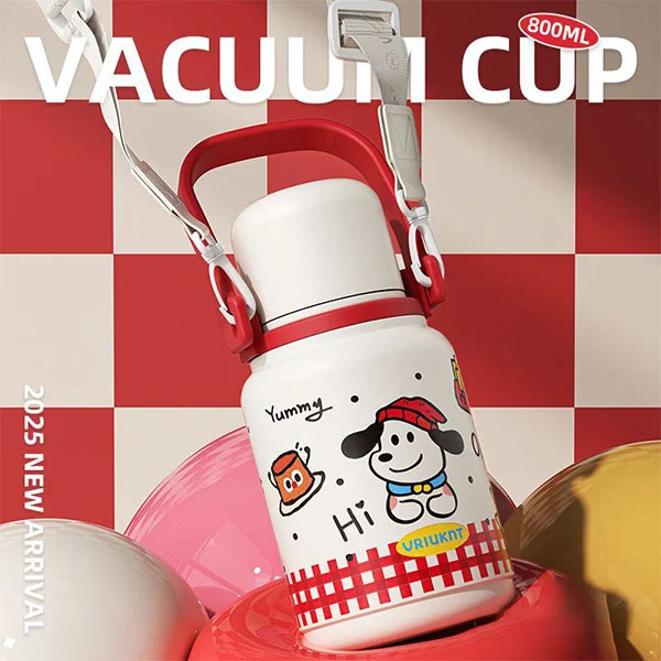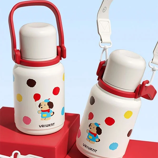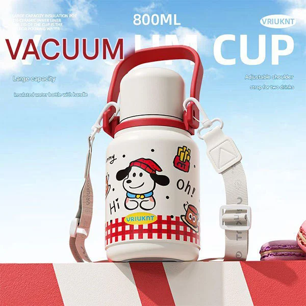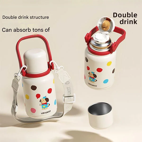 Vacuumflasken for oppvaskmaskin kommer med et stort håndtak og kommer med en skulderstropp, egnet for barn eller voksne for å løfte og frigjøre hendene. Lokket kan også fungere som en vannkopp